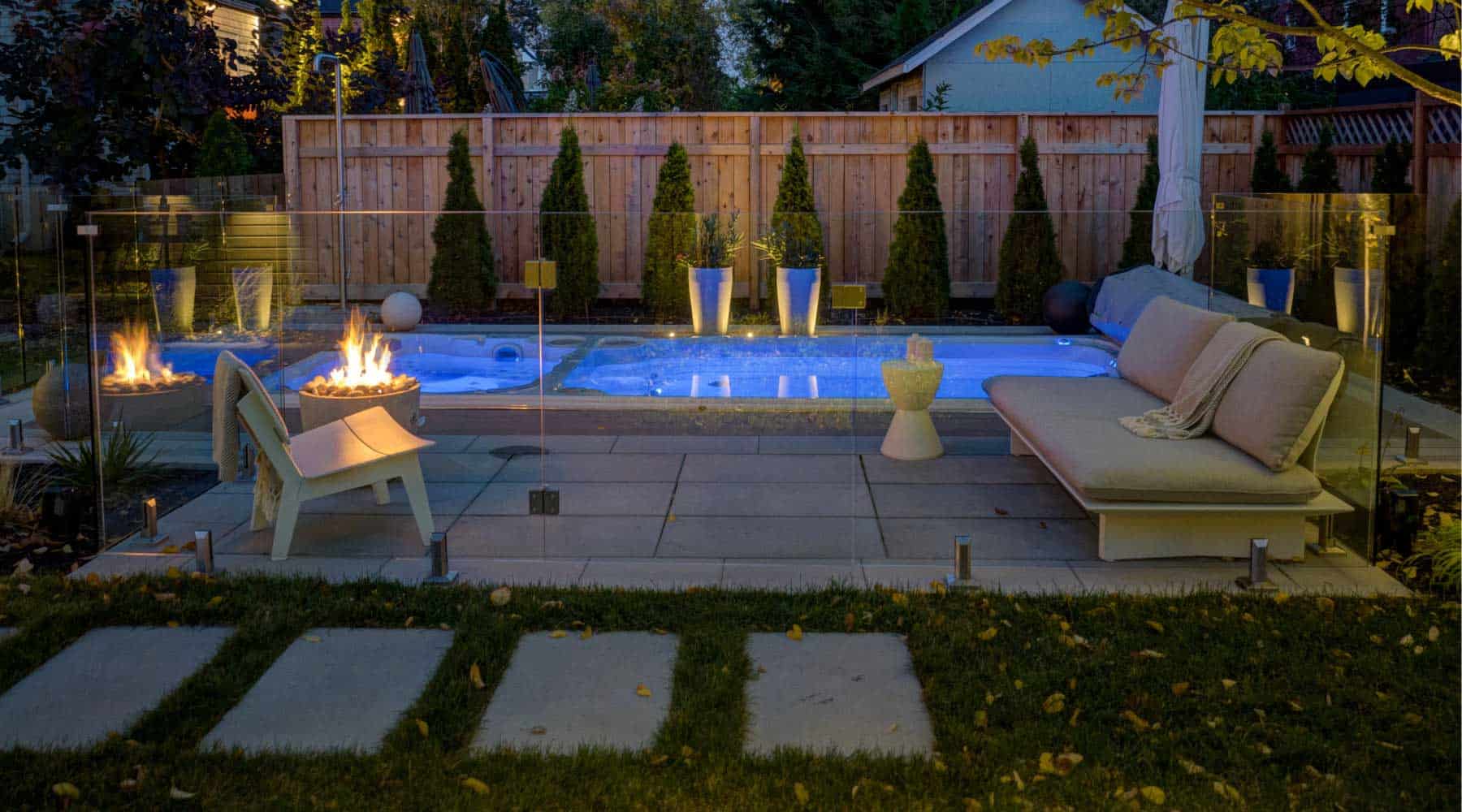Dans cette réalisation, l’entrepreneur a ajouté des éléments d’éclairage, apportant ainsi une dimension supplémentaire à l’aménagement. Ce détail, en plus d’être fonctionnel, offre une ambiance unique lors des soirées en plein air.