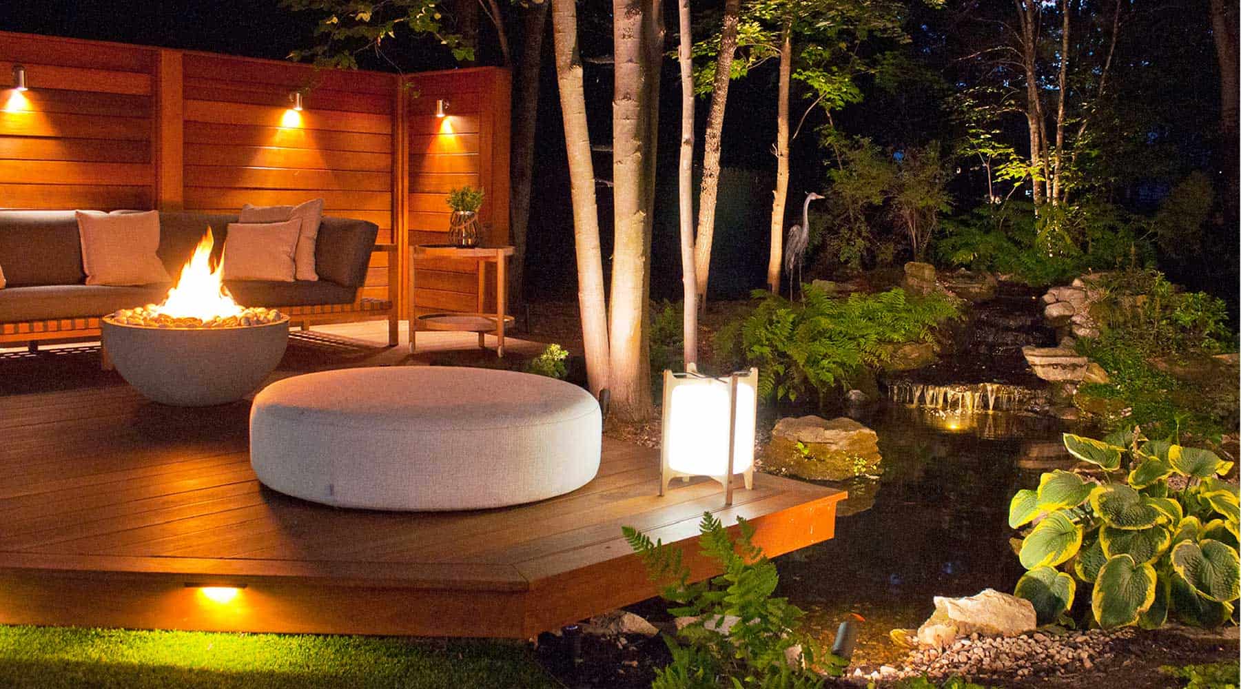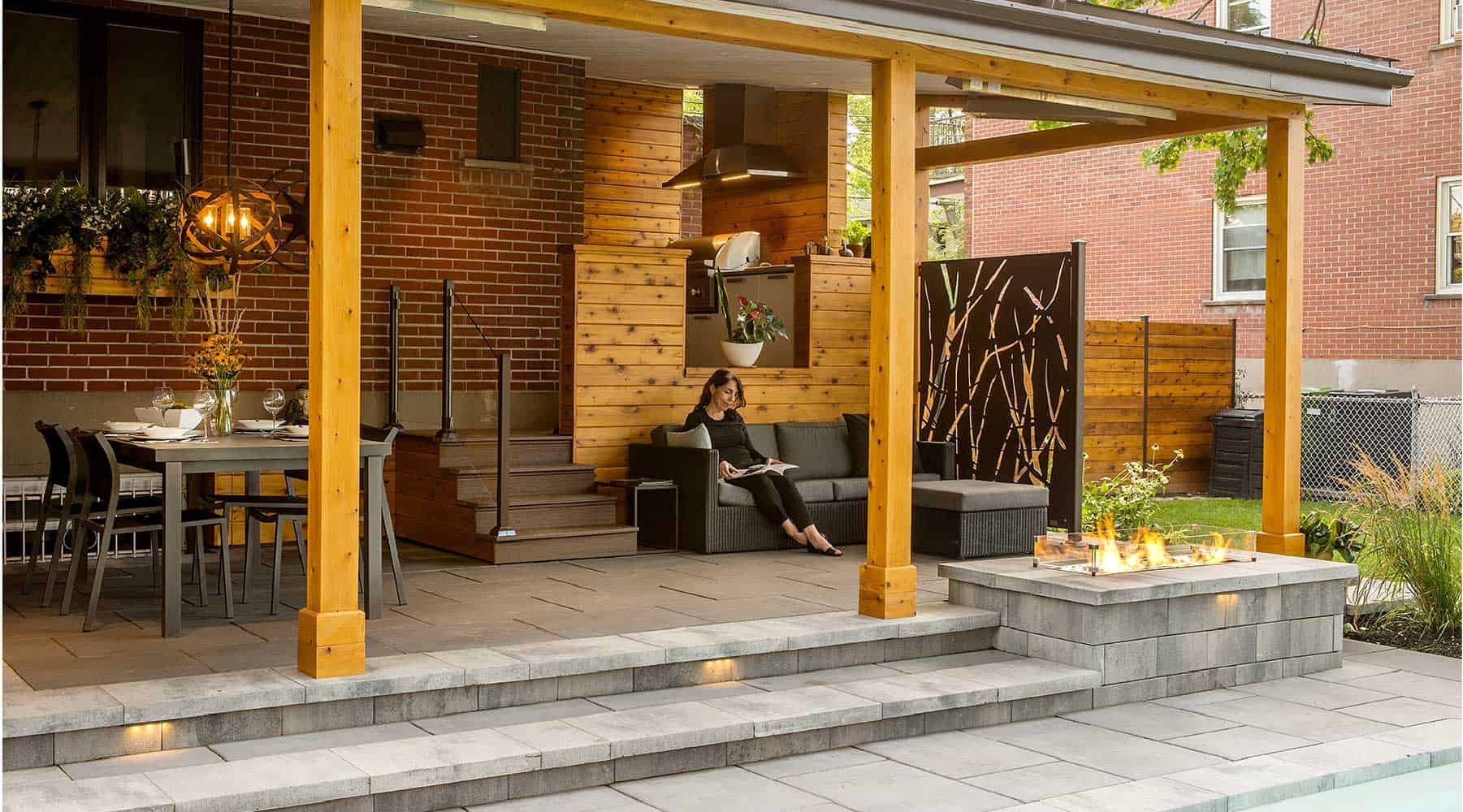 Prenons comme exemple ce salon extérieur où l’entrepreneur certifié Maître Paysagiste a conçu un mur d’intimité bien pensé. Le haut du mur est réalisé pour préserver la vue sur le reste du jardin, mais préserve aussi l’intimité lorsque l’on est assis. Une solution à la fois élégante et fonctionnelle.