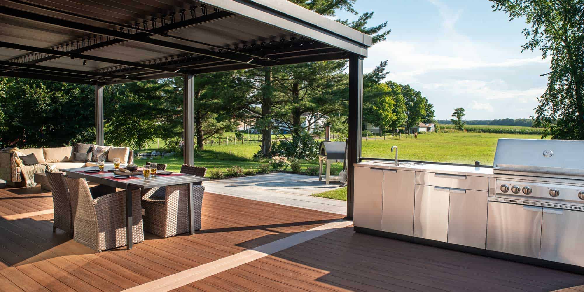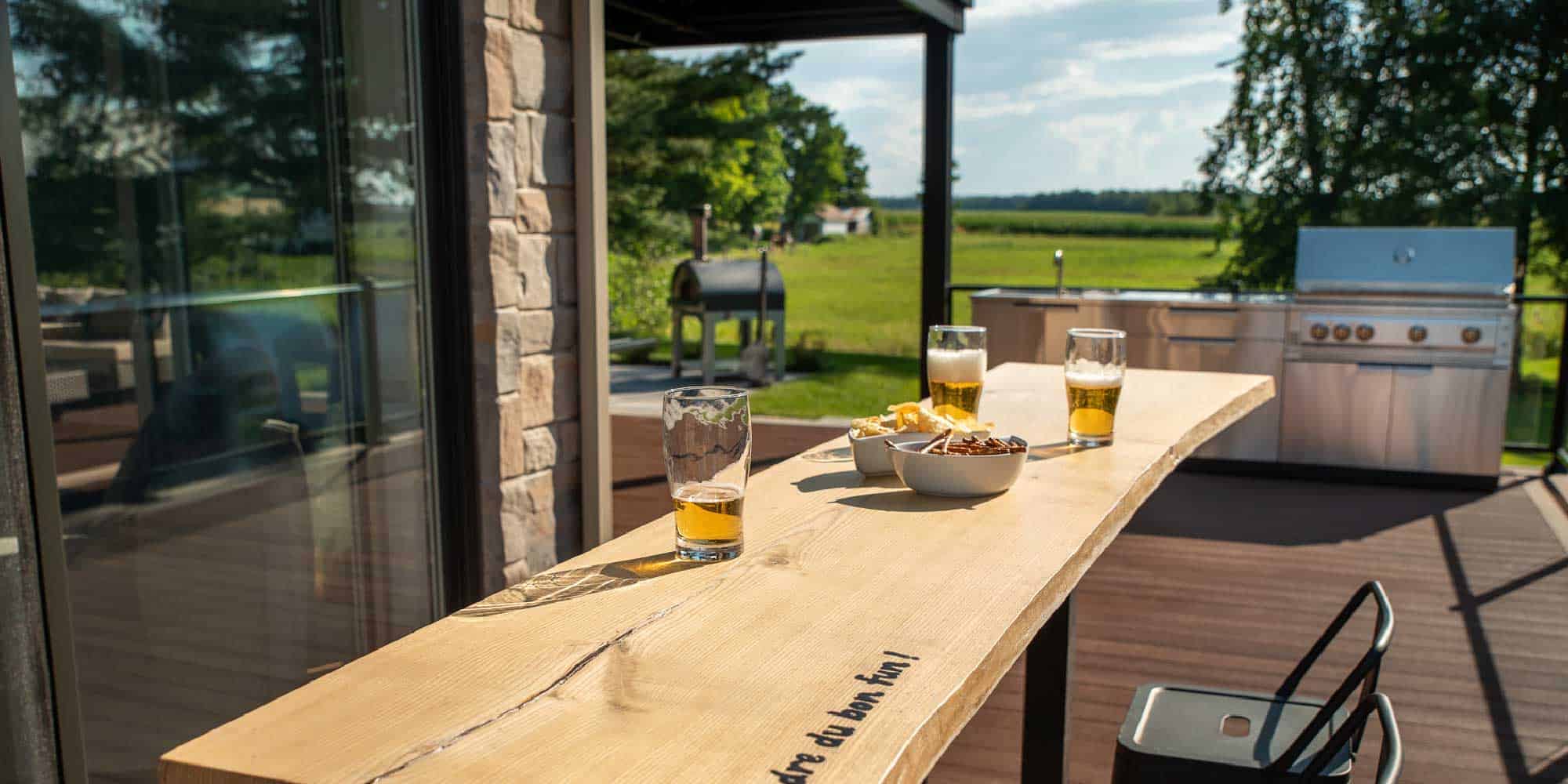 Cette magnifique terrasse multifonctionnelle permet non seulement de profiter pleinement de l’été, mais rien n’a été laissé au hasard afin de le faire le plus longtemps possible. L’aménagement d’une cuisine extérieure complète non loin de la maison favorise l’utilisation du barbecue sur une longue période, à l’année si les propriétaires le souhaitent.