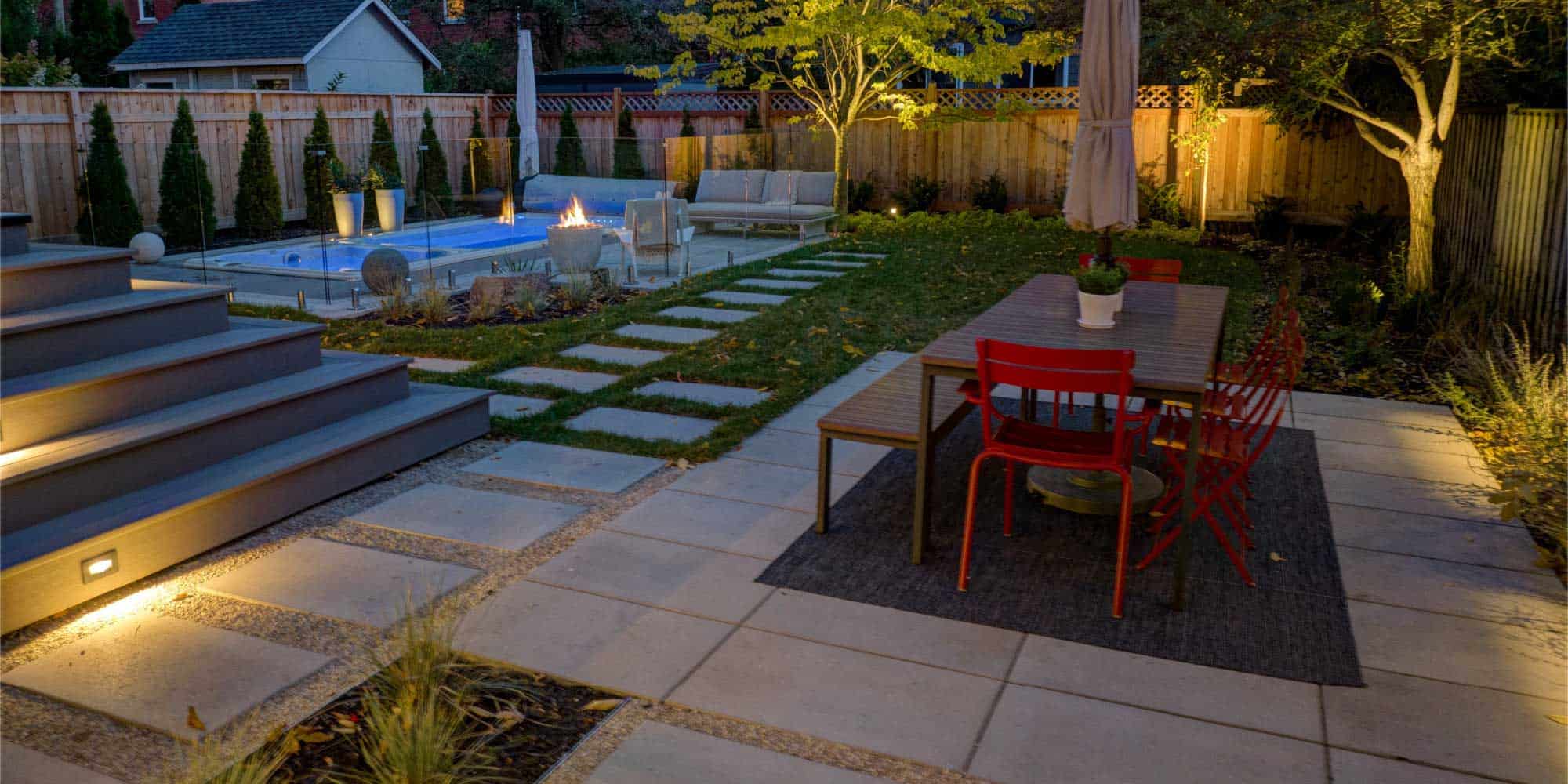 Cette cour accueillante et chaleureuse est savamment éclairée pour mettre en valeur les différentes sections qui s’imbriquent les unes dans les autres avec harmonie. Les utilisateurs de cet espace extérieur n’ont rien à craindre de la baisse des températures, ils sont bien équipés pour vivre dehors, longtemps.