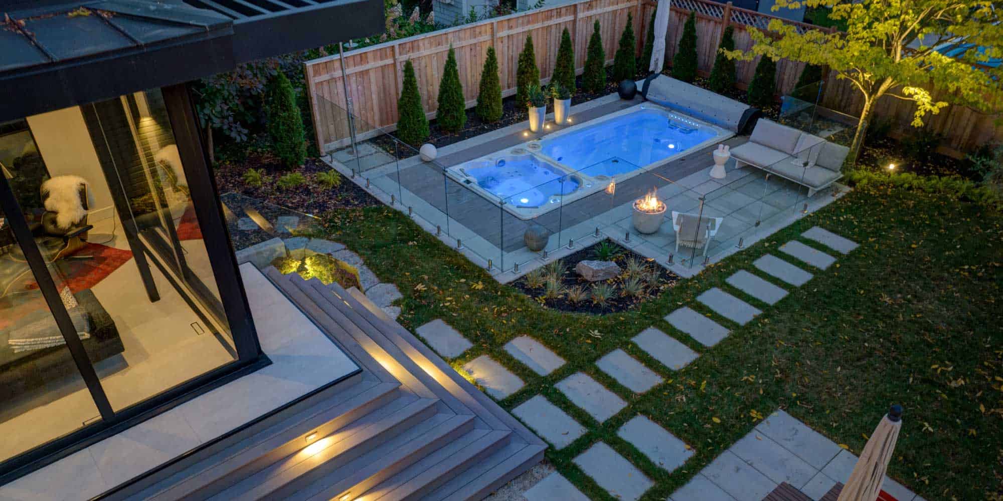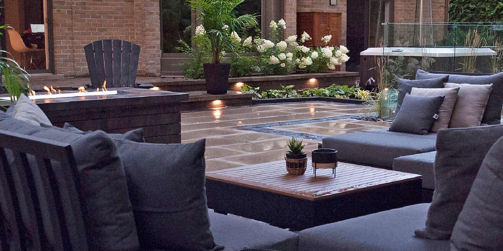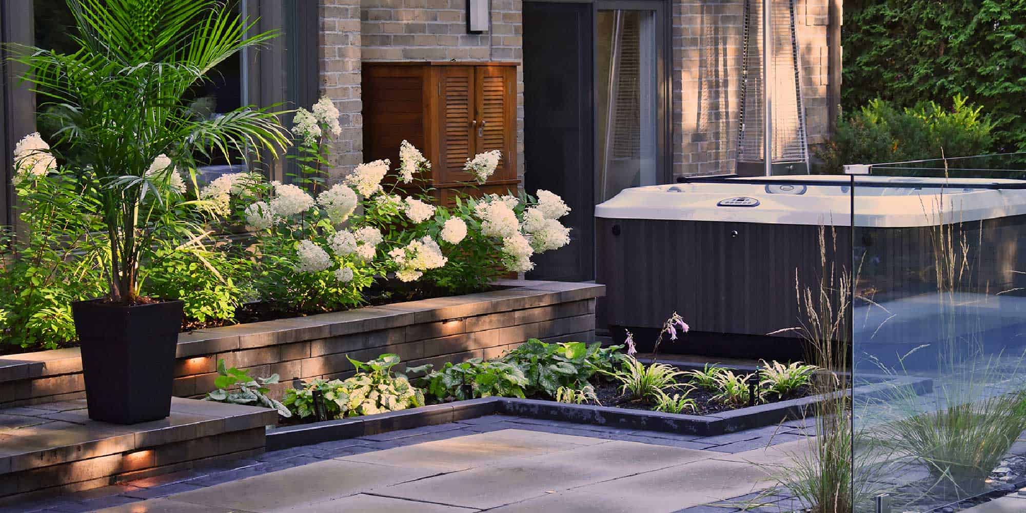 On peut choisir un seul élément pour étirer la saison comme combiner plusieurs manières d’attirer la chaleur dans la cour. Dans cette cour contemporaine, spa, chauffe-terrasse, foyer au gaz et textiles 100 % confort se marient à merveille avec les végétaux à longue durée de vie qui évoluent tout au long de la saison pour atteindre leur paroxysme en fin d’été.