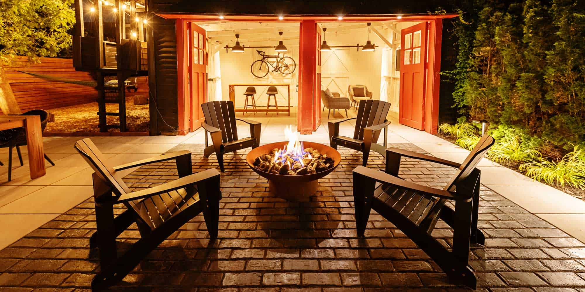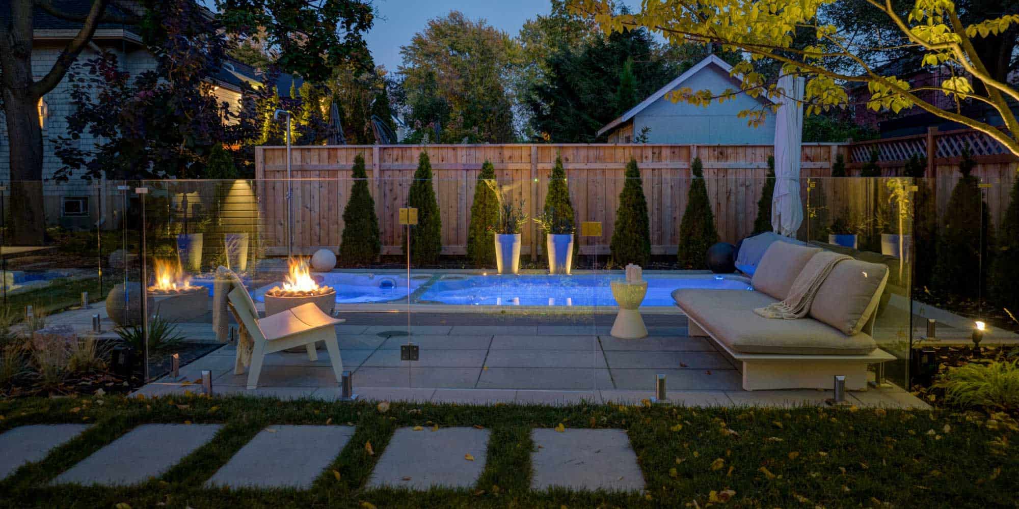 Pour cette cour invitante, afin d’ajouter encore plus de chaleur et optimiser le temps passé à l’extérieur, un foyer au gaz a été ajouté tout près du point d’eau. On peut y prendre place tranquillement dès la sortie de l’eau pour se réchauffer ou simplement s’installer paisiblement et regarder les flammes danser.