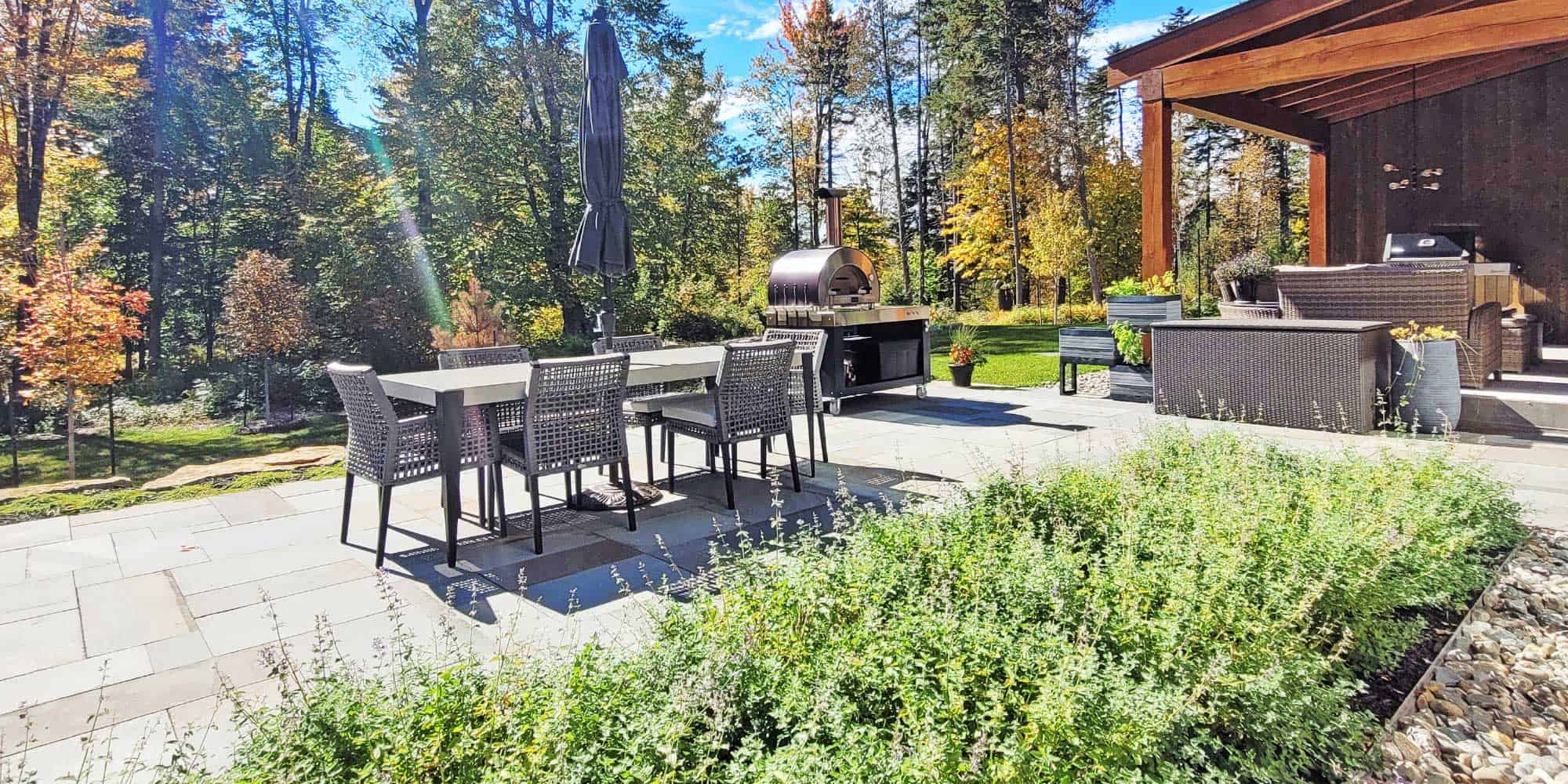 Dans cet espace aménagé, l’élégance rustique est amplifiée par des végétaux sélectionnés avec soin qui gardent leur beauté, même en automne. Ces plantes forment un écrin naturel autour de la terrasse, ajoutant une touche d’harmonie et de sérénité au décor. Mais l’atout majeur de cet aménagement est la cuisine couverte adjacente à la maison. Elle permet de savourer les délices du barbecue bien au-delà de l’été, transformant chaque repas en un moment de pur plaisir. Ainsi, cette combinaison de nature et de fonctionnalité crée un véritable havre de paix pour apprécier chaque instant.