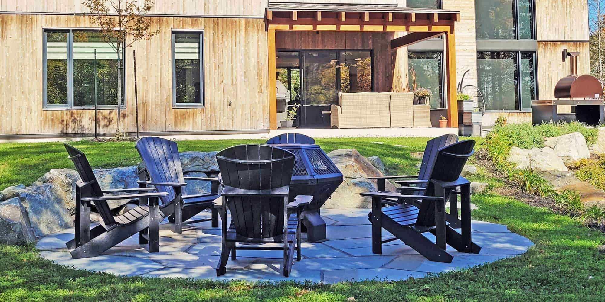 La mise en valeur de la nature environnante permet également de prolonger la vie de l’aménagement paysager. La forêt naturelle qui ceinture la cour se transforme d’elle-même au fil des jours et offre un nouveau paysage aux occupants. Le foyer central donne envie d’étirer le temps encore plus pour admirer ce spectacle sans égal.