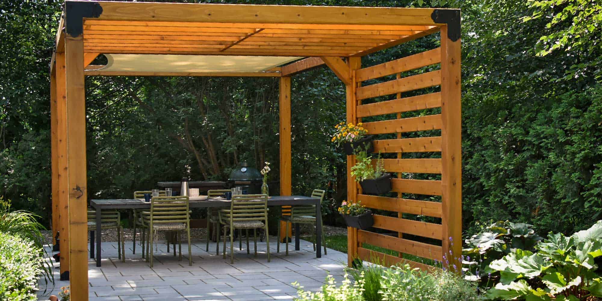 Les tonnelles sont aussi des bons moyens d’ajouter de la chaleur aux espaces. On peut y accrocher des toiles qui permettent de créer de l’ombre oui, mais aussi de protéger les occupants. Des paravents ou autres tissus peuvent être utilisés pour fermer les côtés si désiré, afin d’assurer un certain contrôle des éléments. De plus, le toit peut servir à accrocher des chauffe-terrasse ou autres modules de chauffage d’appoint permettant d’augmenter la température de quelques degrés fort appréciables lors des journées plus froides.