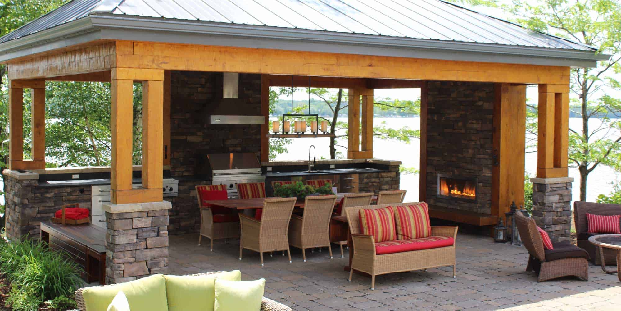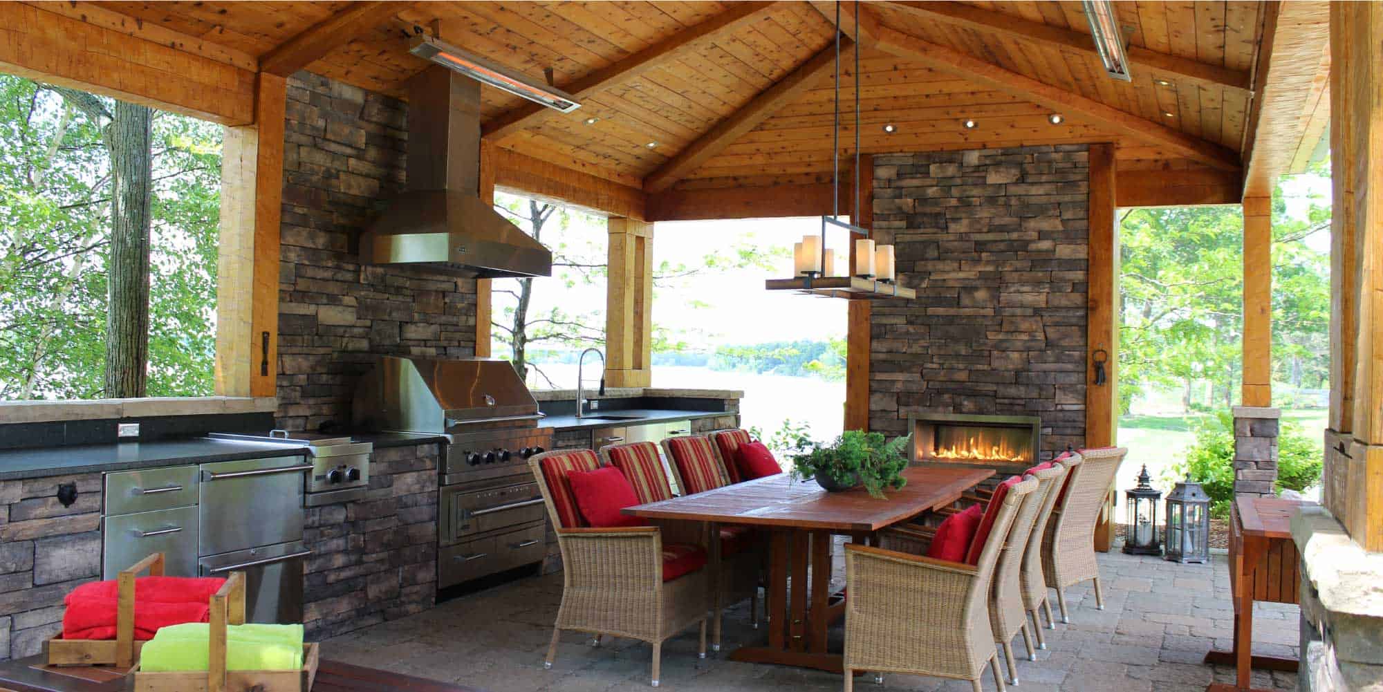 Cet abri de type Pool House qui surplombe la rivière a été créé spécifiquement pour étirer le temps et profiter de la vie au maximum. La cuisine complète, entièrement couverte, permet aux propriétaires et à leurs invités de profiter de longues soirées à l’extérieur, même lorsque le climat n’est pas totalement favorable. L’utilisation de toiles permet de maximiser la lumière naturelle tout en protégeant l’espace du vent et de la pluie au besoin.