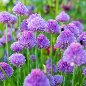La ciboulette, avec ses magnifiques fleurs mauves en forme de boules hérissées qui semblent déposées sur le feuillage vert bien dressé.