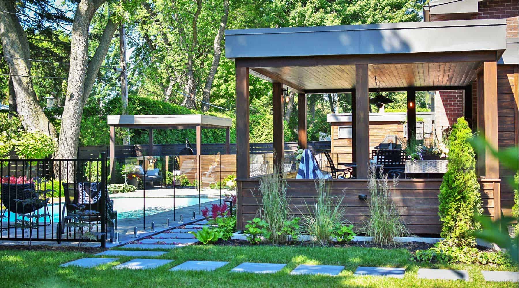 Souvent, la pergola sert d’extension à la maison, comme une nouvelle pièce qui ouvre vers l’extérieur. Que ce soit pour créer votre salle à manger extérieure ou simplement pour avoir un coin détente, la pergola ajoute une dimension supplémentaire à votre maison. Il est très tendance d’y ajouter des luminaires à l’intérieur qui offrira un éclairage doux à votre espace extérieur.