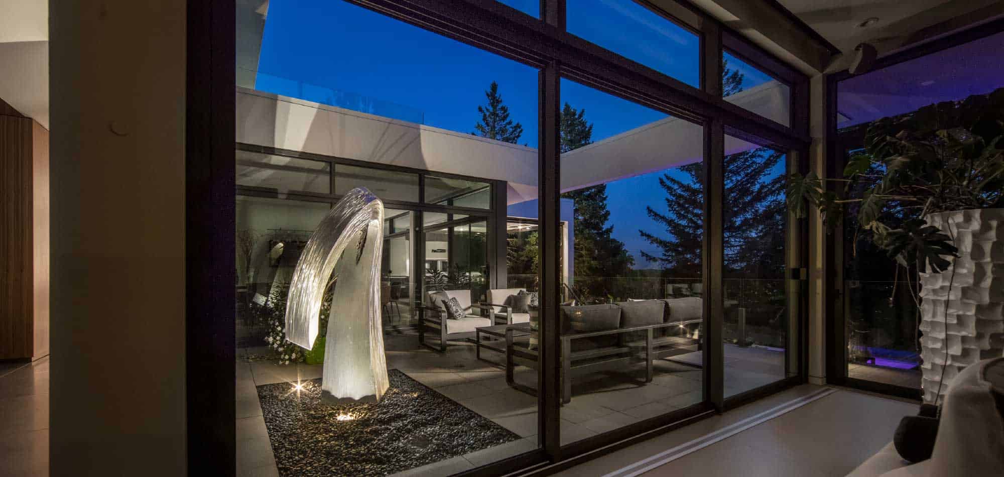 L’effet est saisissant! Tout est réfléchi de manière à ce qu’on puisse apprécier toute l’architecture et le paysage dès la tombée de la nuit grâce à un éclairage sur mesure bien pensé. Les éléments naturels et construits sont mis en valeur. Le style sobre et épuré de la maison se prolonge sur la terrasse, où les résidents peuvent apprécier le temps qui passe.