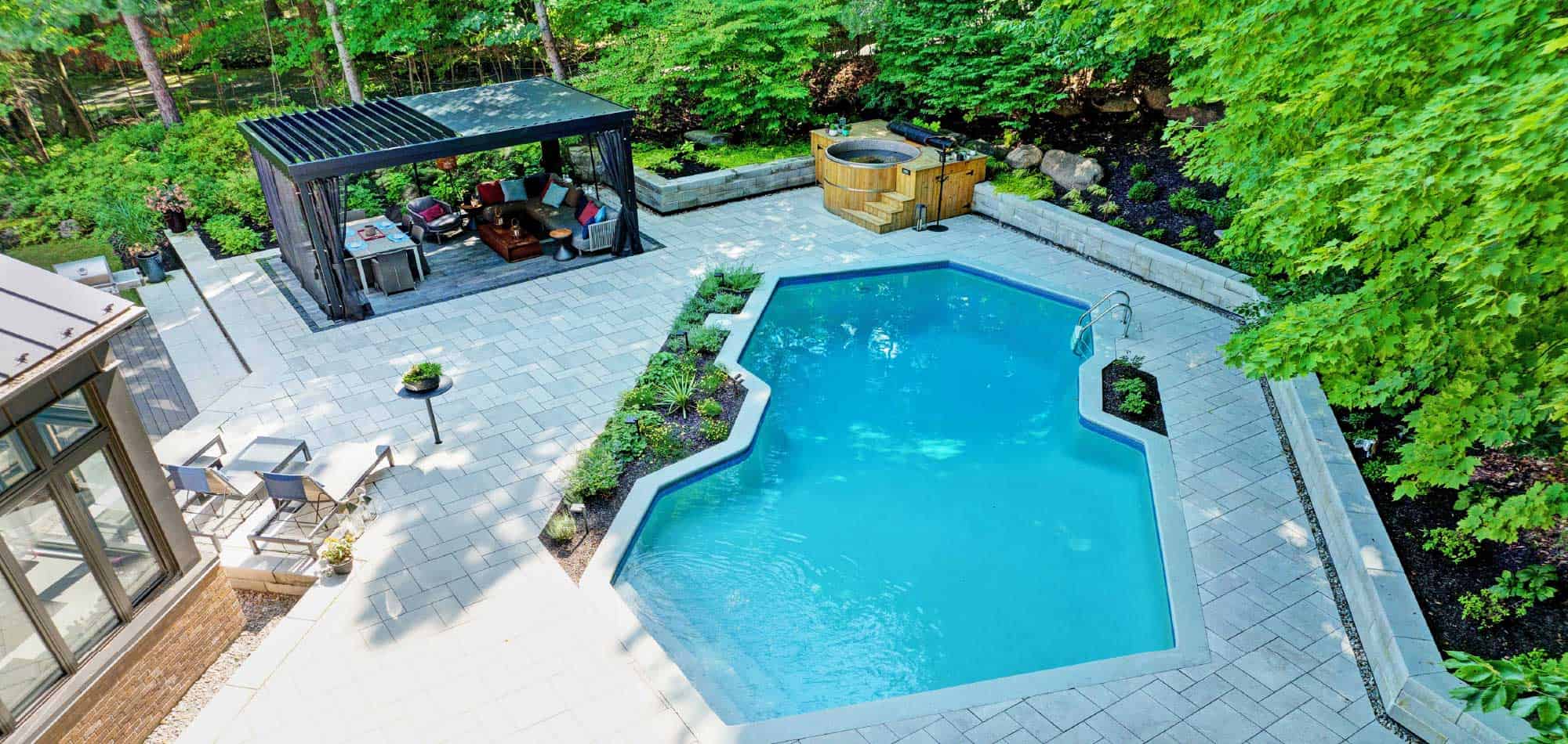 Créer une cour de rêve invitante et festive autour de la piscine déjà présente sur le site : voilà le mandat que s’est vu confier l’équipe de Martel Paysagiste. Les propriétaires de la maison située à flanc de montagne aimant recevoir plusieurs invités, ils ont demandé une grande surface pavée permettant d’accueillir confortablement tous les convives.