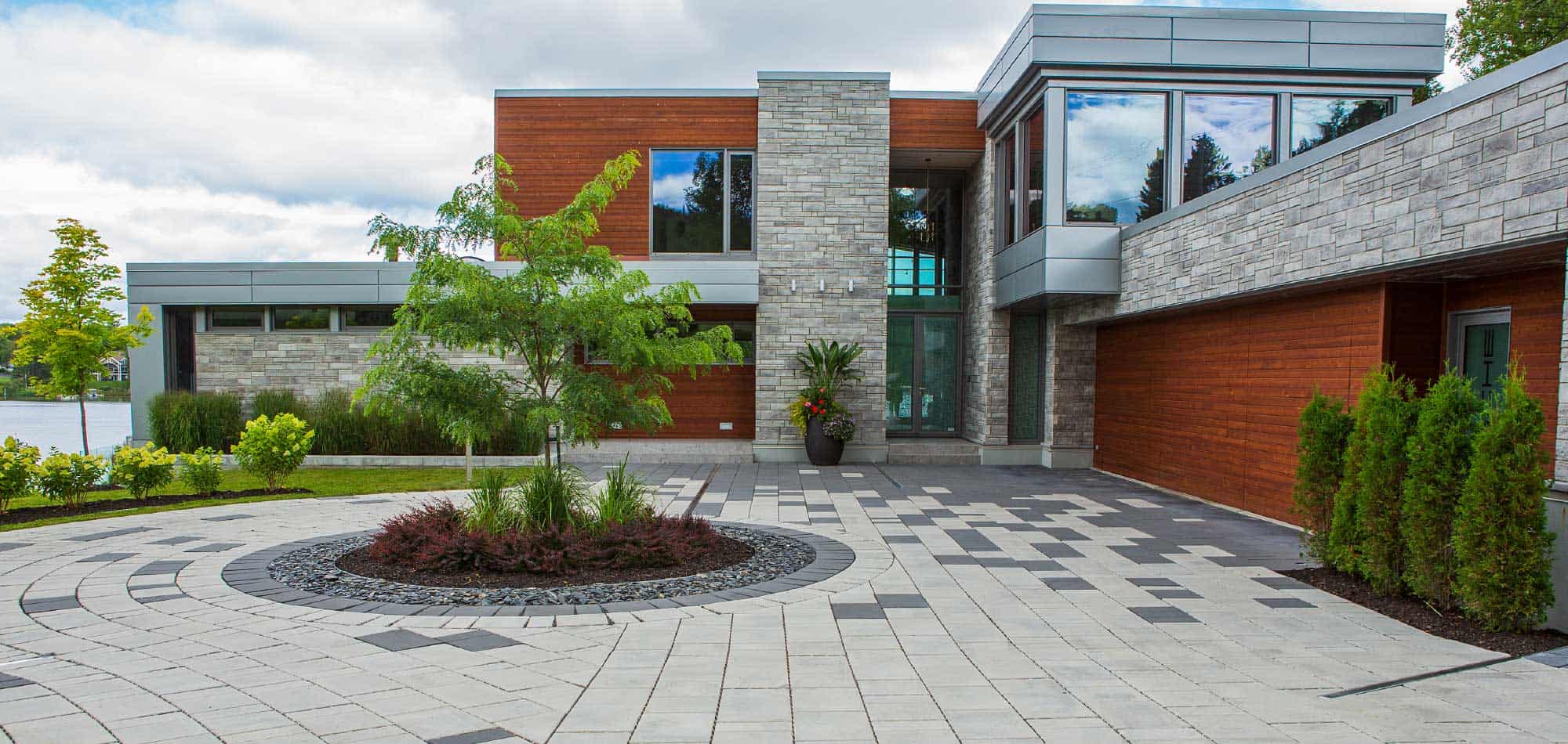 Les lignes courbes de l’allée adoucissent l’architecture de la maison tout en lui laissant la vedette. Les différentes couleurs de pavés, créant l’effet pixélisé du plus pâle au plus foncé, donnent du dynamisme à cette grande surface.