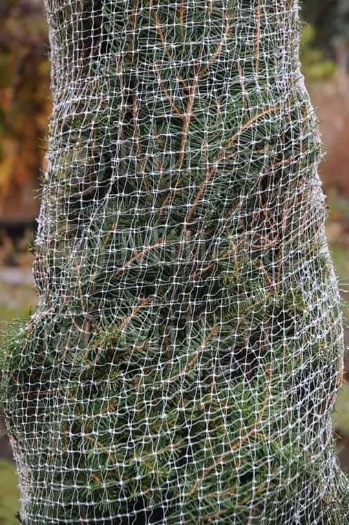 Attendez fin novembre pour la pose de protection hivernale. Priorisez les conifères dont les branches pourraient ployer sous le poids de la neige, les arbustes peu rustiques ou situés aux abords des routes et sensibles aux sels de déglaçage ou aux vents desséchants. Les petits rongeurs aiment bien grignoter l’écorce des jeunes arbres l’hiver. La mise en place d’une bande spiralée blanche perforée protégera la base du tronc des petits gourmands.