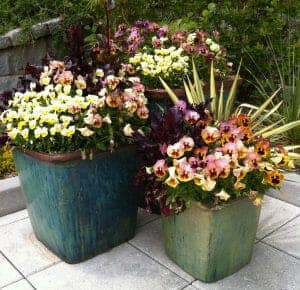 Un superbe arrangement printanier composé de la pensée Delta® ‘Premium Persian Medley’ (Viola x wittrockiana Delta® ‘Premium Persian Medley’) et de la violette Penny™ ‘Primrose Bicolor’ (Viola cornuta Penny™ ‘Primrose Bicolor’), deux annuelles pouvant résister sans problème à des températures sous le point de congélation. On y retrouve aussi la betterave ‘Bull’s Blood’ (Beta vulgaris ‘Bull’s Blood’), une plante potagère au joli feuillage pourpre particulièrement résistante au froid.