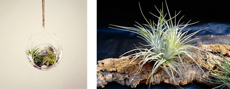 Conseil pour l’entretien : Adaptables et très peu exigeantes, les tillandsias peuvent être facilement cultivées à l’intérieur comme à l’extérieur. Comme la plupart des tillandsias ne possèdent pas de racines, elles ne doivent pas par conséquent être cultivées dans un pot. Il suffit simplement de les déposer dans un récipient, sans terreau, de les suspendre avec du fil ou de les accrocher à une plaque de bois. Certaines espèces de tillandsias sont si petites qu’elles peuvent même être cultivées dans des éprouvettes ou des bouchons de liège troués !