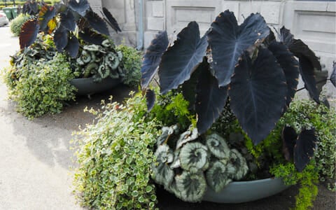 Le colocasia ‘Black Magic’ orne le centre de ces arrangements