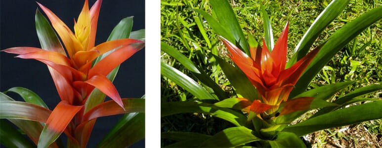 L’une des broméliacées les plus populaires et les plus vendues sur le marché horticole canadien est assurément le guzmania. Cette plante présente des feuilles vertes luisantes disposées en rosette au centre desquelles se forme une série de bractées de couleur jaune, orange, rose ou rouge, selon les cultivars. Les fleurs minuscules sont disposées au sommet de ce groupe de bractées qui demeure attrayant pendant une période très prolongée, allant parfois jusqu’à près d’un an.